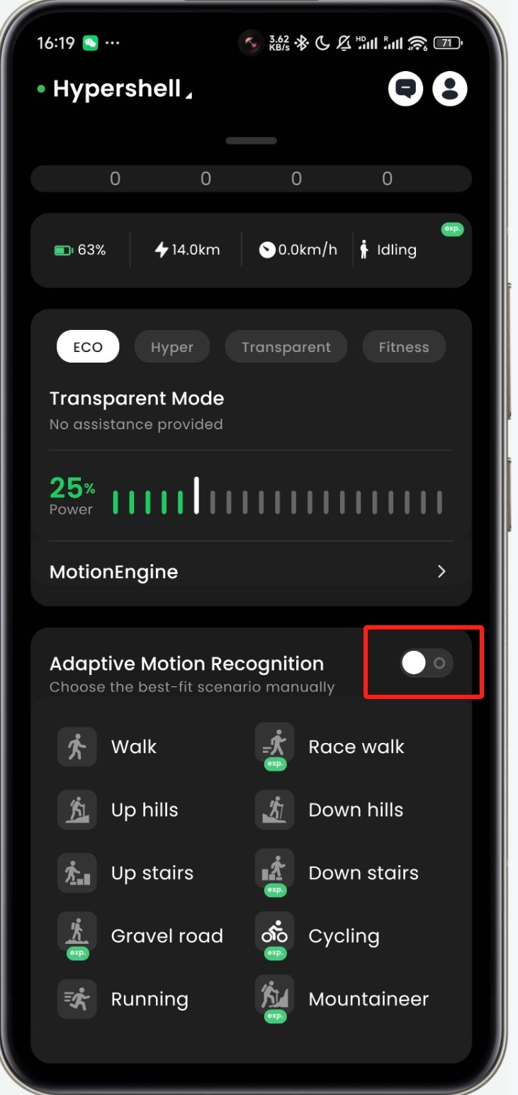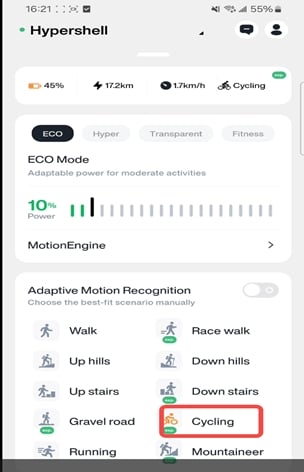 • Per passare manualmente, disattiva il Riconoscimento Adattivo del Movimento, quindi seleziona la Modalità Ciclismo dalle opzioni disponibili.