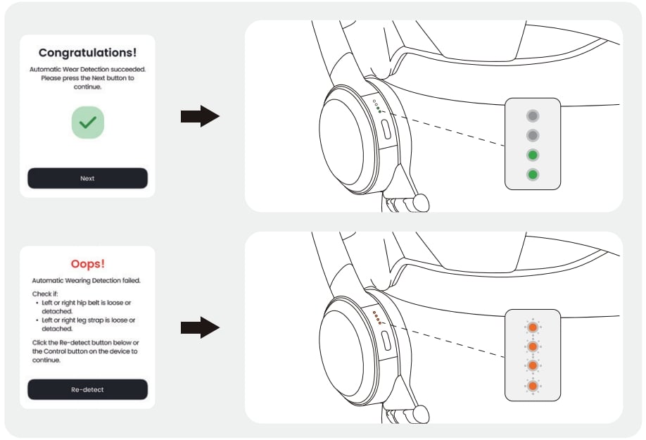 Se la connessione ha esito positivo, l'esoscheletro passerà alla modalità Eco. Segui i passaggi forniti nell'app per completare la procedura di configurazione. Una volta connesso, sei pronto per iniziare a utilizzare il tuo esoscheletro Hypershell con l'app!