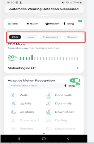 Nell'interfaccia dell'app, scegli tra la modalità Hyper, Eco o Transparent